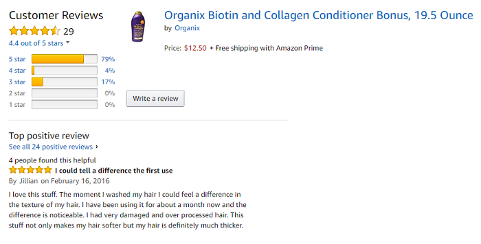 Jilian: “Tôi yêu sản phẩm này. Ngay khi tôi gội đầu, tôi có thể cảm nhận được sự khác biệt về mái tóc của tôi. Tôi đã thử sử dụng sản phẩm này trong khoảng một tháng và sự khác biệt thật là đáng kinh ngạc. Sản phẩm này không chỉ làm cho tóc của tôi mềm hơn mà còn dày hơn nhiều.”