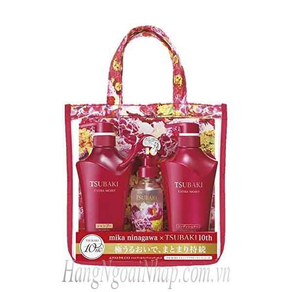 Bộ ba Shiseido Tsubaki Extra Moist 10th ra đời nhân kỉ niệm 10 năm Tsubaki có mặt trên thị trường Nhật Bản. Đây là phiên bản đặc biệt, được nhiếp ảnh gia nổi tiếng Mika Ninagawa & Tsubaki 10th kết hợp cho ra một bộ sản phẩm chăm sóc tóc trong một túi xách nhỏ xinh được in hình ảnh hoa trà Nhật Bản của Mika Ninagawa.