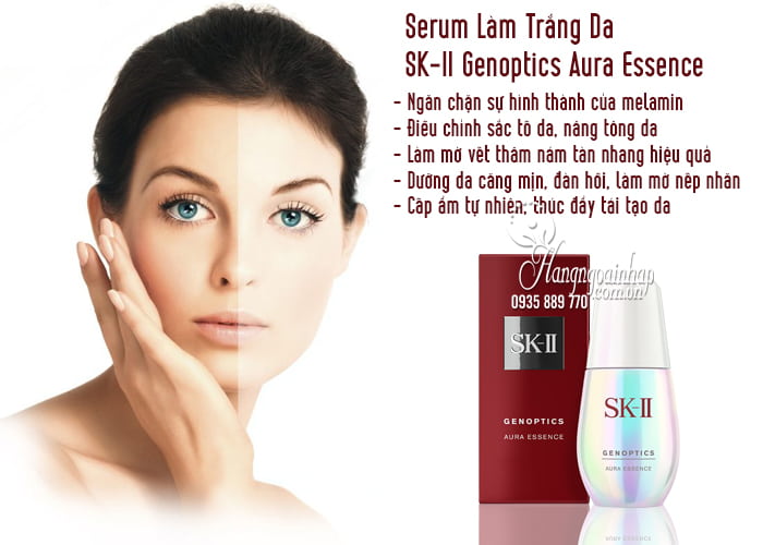 Serum Làm Trắng Da SK-II Genoptics Aura Essence 50ml là một công thức độc đáo giúp dưỡng trắng da. Hoạt chất và dưỡng chất có trong serum này giúp loại bỏ tế bào chết, xóa mờ melamin, nám tàn nhang, làm trắng da rõ rệt (*) đồng thời tái tạo da, phục hồi sự săn chắc cho da căng mịn, giảm nếp nhăn. Hiệu quả đã được kiểm chứng bởi hàng triệu phụ nữ tại Nhật và nhiều quốc gia trên Thế giới.