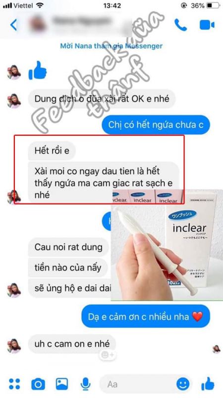 Kim Liên NT (TP. HCM): Chồng mình thường xuyên đi công tác cứ 2 -3 tuần mới về 1 lần, ấy vậy mà ổng cảm nhận được ngay sự khác biệt sau khi mình dùng Inclear của Nhật nhé! tài ghê. Gel dùng dễ dàng, thiết kế rất vệ sinh, thích nhất là nó không làm khô âm đạo, cũng không gây ngứa khó chịu. Ngoài se khít âm đạo thì mình còn cảm thấy nó giúp vùng kín trơn ẩm hơn ấy, rất hay cho chị em phụ nữ chúng mình.