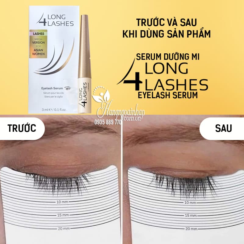 Tú Uyên (26 tuổi, Huế): Mình đã dùng 3 lọ serum dưỡng mi Long 4 Lashes, và thấy có tác dụng nè. Thực sự thì đầu tư em này rẻ hơn so với việc đi nối mi hàng tuần, mà lại không bị đau hay gây hại cho mắt.