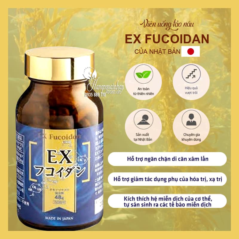 Viên uống EX Fucoidan được sản xuất tại Nhật Bản là một sản phẩm chiết xuất từ tảo nâu. Hàm lượng Fucoidan cao có thể giúp phòng ngừa và hỗ trợ cải thiện ung thư, nhờ tăng cường miễn dịch.