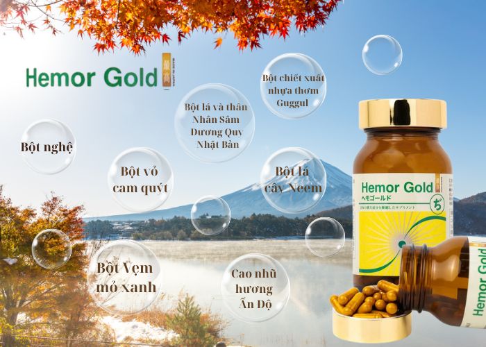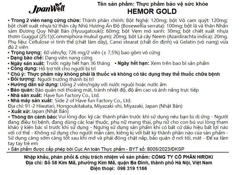 Hemor Gold JpanWell là viên uống hỗ trợ giảm các triệu chứng trĩ có nguồn gốc từ Nhật Bản, được chiết xuất hoàn toàn từ thảo dược tự nhiên như nghệ, nhũ hương Ấn Độ, Đương quy Nhật Bản, vỏ cam quýt, vẹm mỏ xanh, Guggul và lá Neem. Sản phẩm giúp giảm viêm, giảm sưng đau, cải thiện tuần hoàn máu, làm co búi trĩ và hỗ trợ hệ tiêu hóa hoạt động khỏe mạnh. Với cơ chế tác động từ bên trong, Hemor Gold không chỉ giúp người bệnh cảm thấy dễ chịu hơn mà còn giúp ngăn ngừa tái phát trĩ nếu được kết hợp cùng chế độ ăn uống và sinh hoạt hợp lý. Đây là lựa chọn phù hợp cho những ai muốn chăm sóc và phục hồi sức khỏe vùng hậu môn.