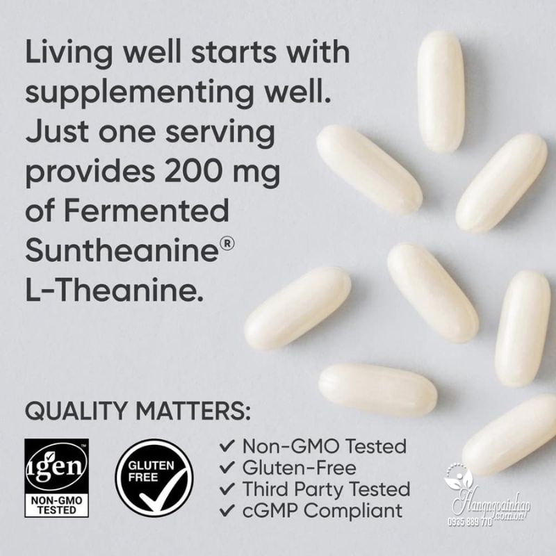 Hàm lượng L-Theanine 200mg/viên - đây là hàm lượng tương đối cao, mang lại hiệu quả rõ ràng sau vài ngày đến vài tuần (*)