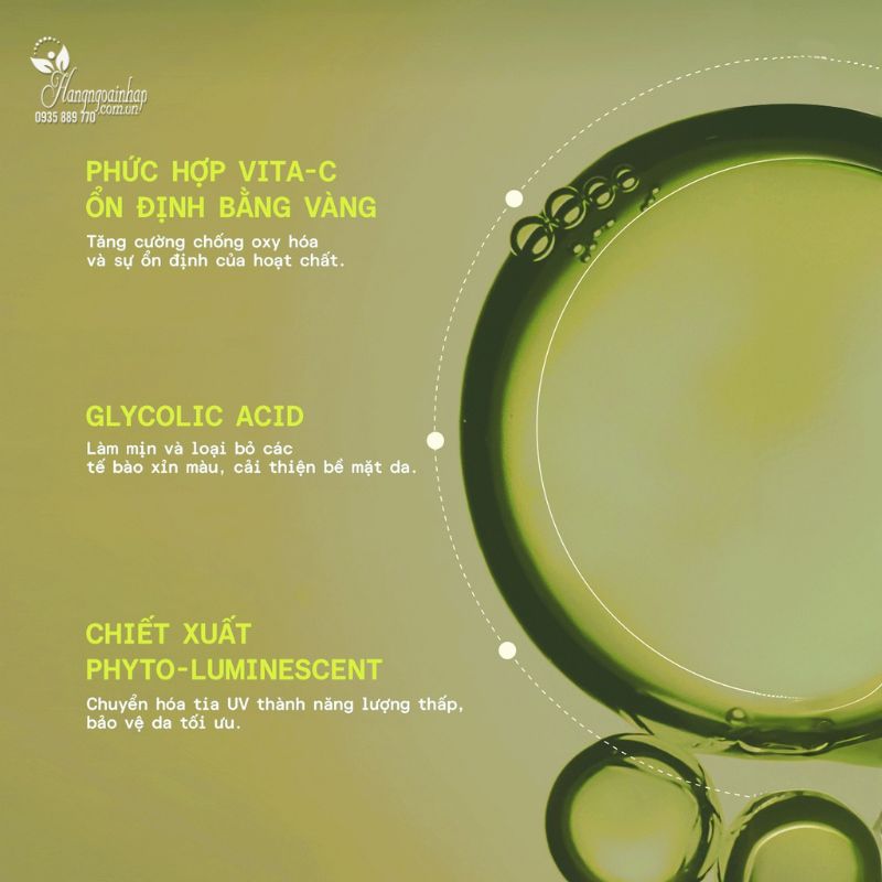 Phức hợp Vita-C độc quyền: Đó là sự kết hợp của vitamin C với thành phần vàng, giúp tăng khả năng chống oxy hóa, hiệu quả mờ thâm, làm sáng da. Nhờ vàng mà vitamin C được ổn định hơn và khả năng thẩm thấu vào da cũng tốt hơn.