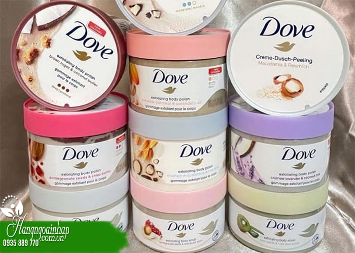 - Tẩy tế bào chết Dove Mỹ có nhiều phiên bản với mùi hương khác nhau, dễ dàng lựa chọn mùi theo sở thích hoặc nhu cầu chăm sóc.
