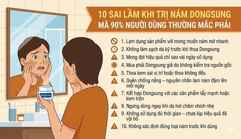 10 Sai Lầm Khi Trị Nám Dongsung mà 90% người dùng thường mắc phải lại chính là lý do khiến hiệu quả loại bỏ thâm sạm trở nên chậm chạp hơn dự kiến. Nếu bạn đang sử dụng Dongsung nhưng nám vẫn “bám trụ”, rất có thể bạn đang rơi vào một trong những sai lầm dưới đây. Bài viết này sẽ giúp bạn “gỡ rối” toàn bộ.