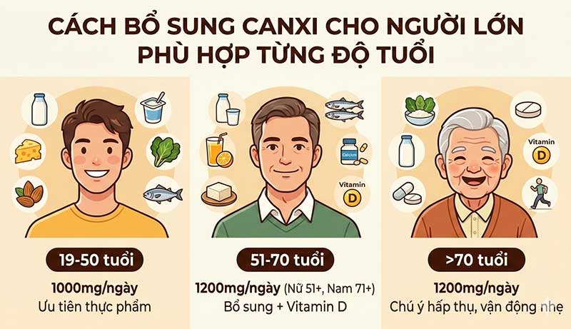 Cách bổ sung canxi cho người lớn phù hợp từng độ tuổi không phải công thức cứng nhắc, mà cần linh hoạt theo phản ứng của cơ thể.